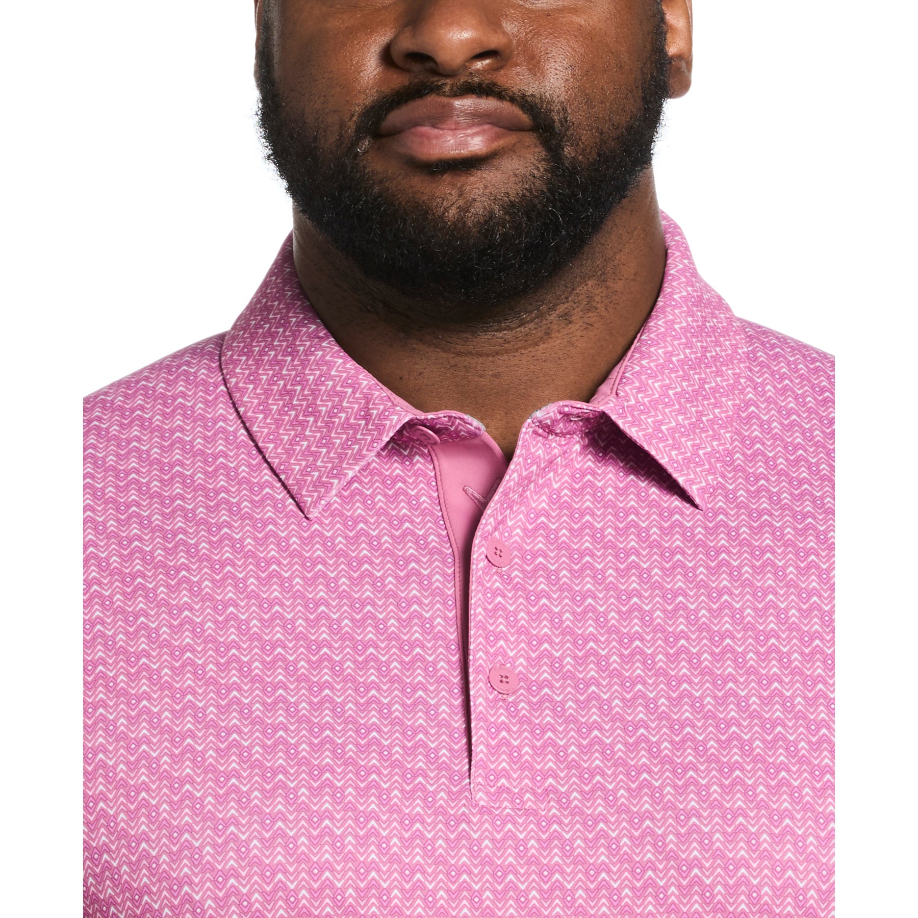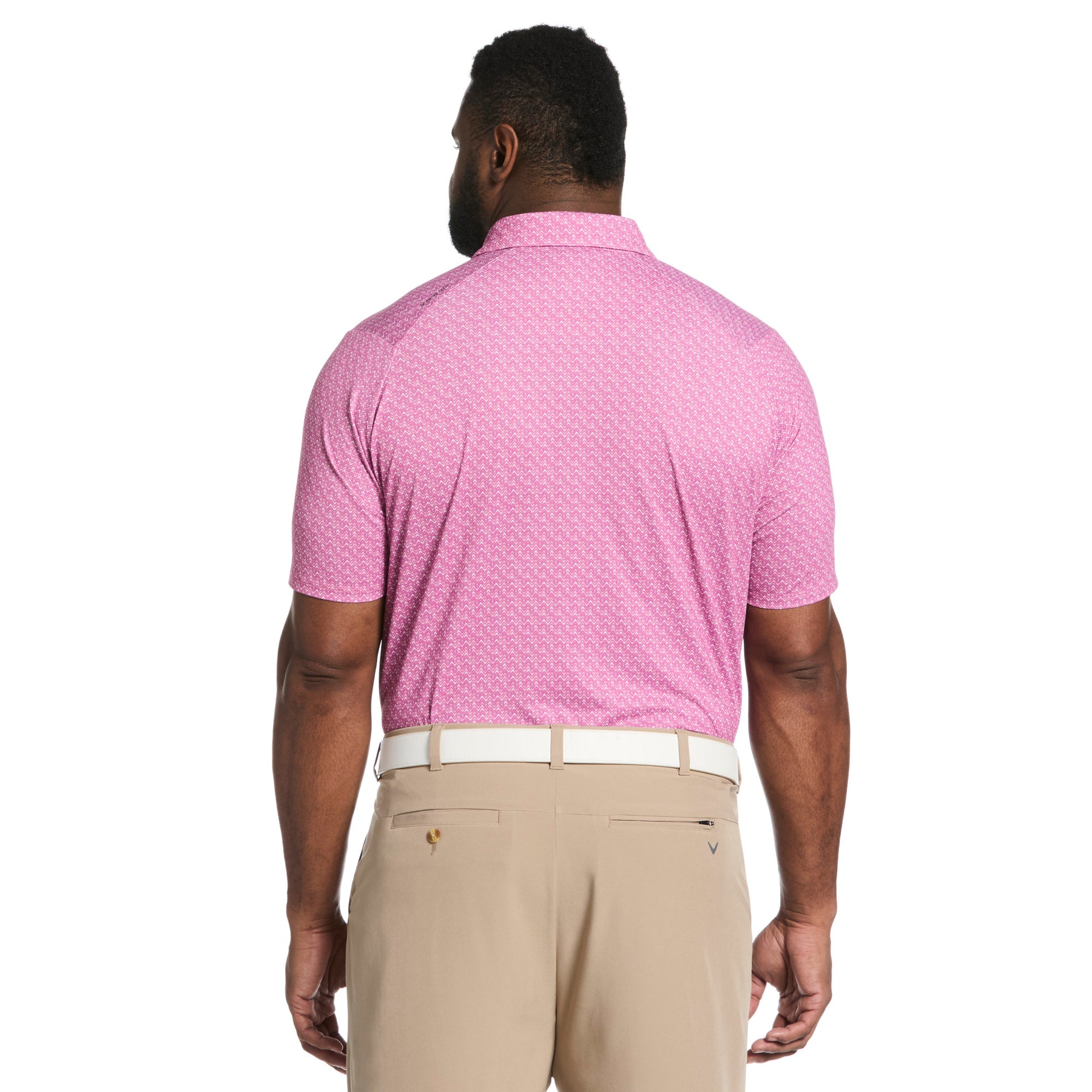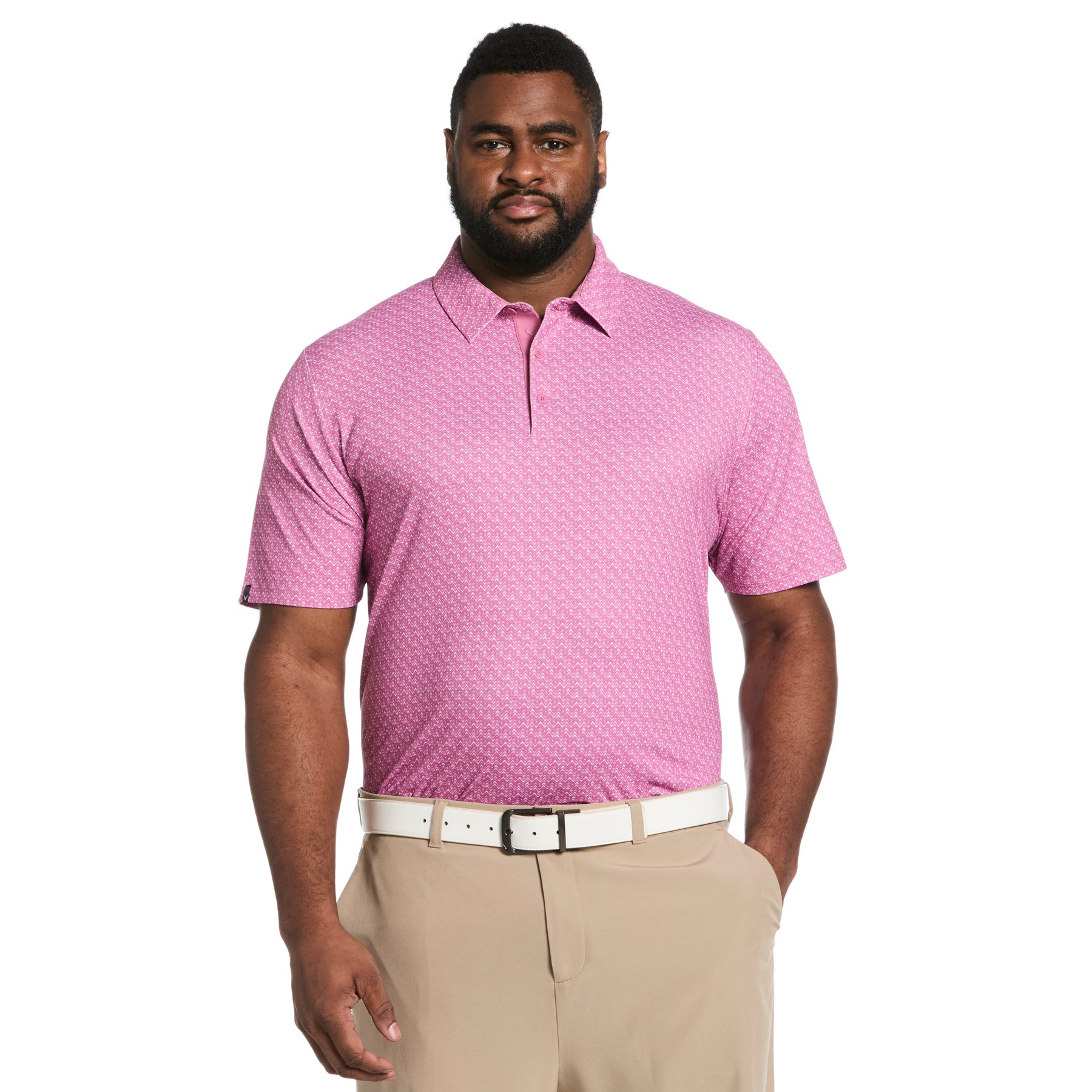 Step onto the green with confidence in this men's golf polo from Callaway Apparel, crafted from lightweight single knit fabric that incorporates recycled polyester. Designed for peak performance, it features Opti-Dri™ moisture-wicking technology to keep you comfortably dry, and built-in sun protection to guard against harmful UV rays. Swing Tech™ innovation combined with generous added stretch ensures an exceptional range of motion, allowing for an unrestricted golf swing. The distinctive timeless chevron print offers a sophisticated aesthetic, while the classic self-collar and short sleeves complete this polished look. This Callaway golf shirt is the perfect blend of athletic function and refined style for the discerning golfer.